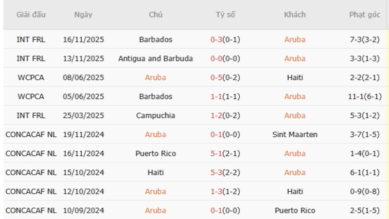 Aruba hiện xếp hạng 191 thế giới dưới sự dẫn dắt của huấn luyện viên Marvic Bermudez. Trong năm trận đấu gần đây, đội bóng Bắc Mỹ này chỉ thua một trận duy nhất trên sân nhà trước Haiti, và gần nhất là chiến thắng đậm 3-0 trước Barbados nên dễ vượt ải chấp 0.5 bàn.